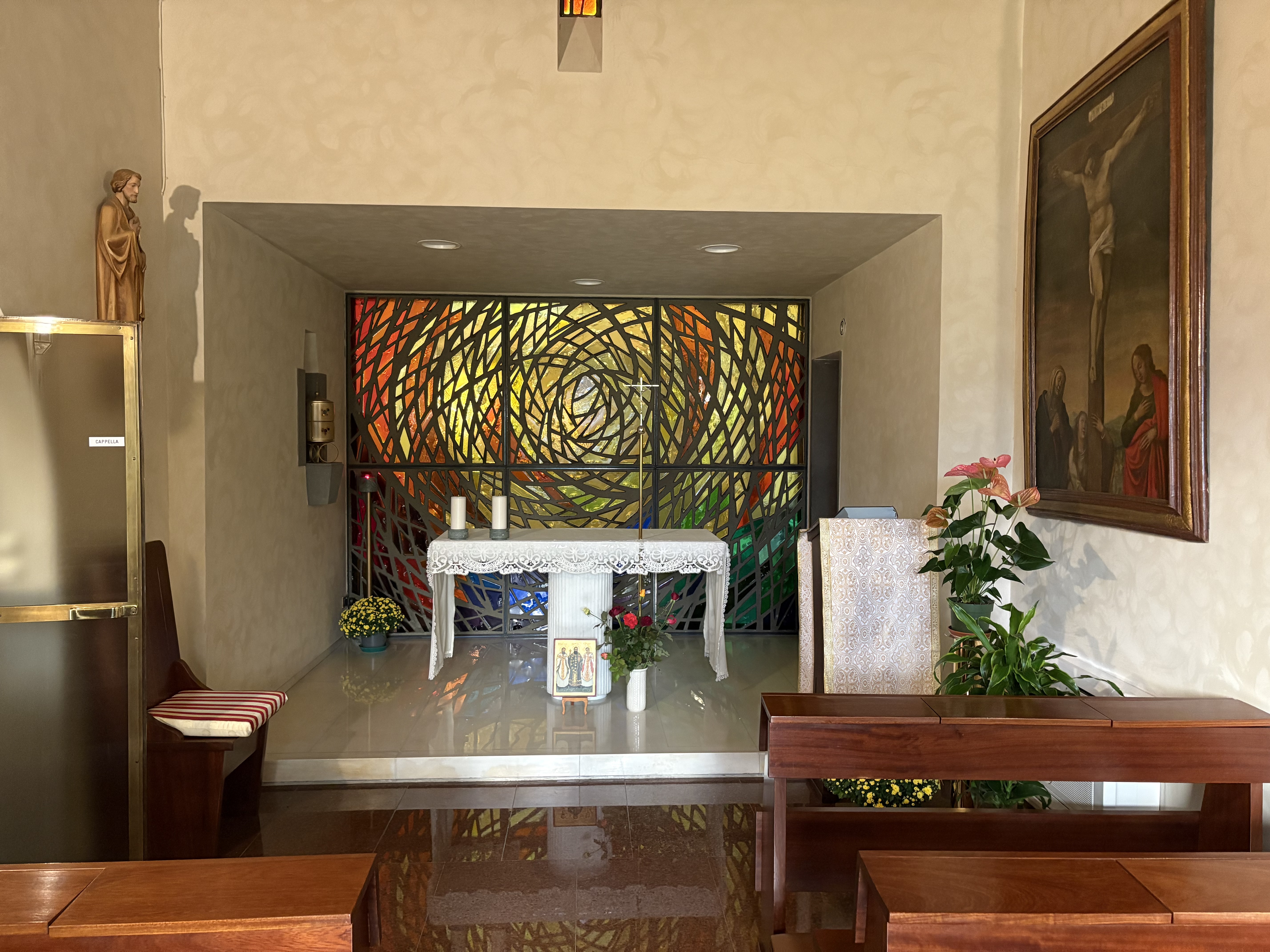 I enjoyed the peaceful garden walks every morning with a quick stop in the Chapel. The Nuns were putting fresh roses from the garden in the vase for the alter. It was nice to see them.