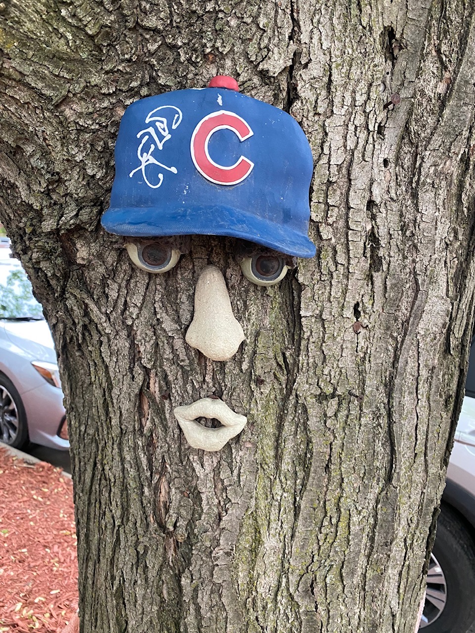 I was visiting a friend, walking the neighborhood and stopped in my tracks when I saw this tree. How clever. This art creation of a Cubs fan took effort. It’s so funny, looks like an older man. Profiling here, tall and a bit chubby, holding a beer, maybe with shirt too tight? We have to go older since the hat looks vintage.