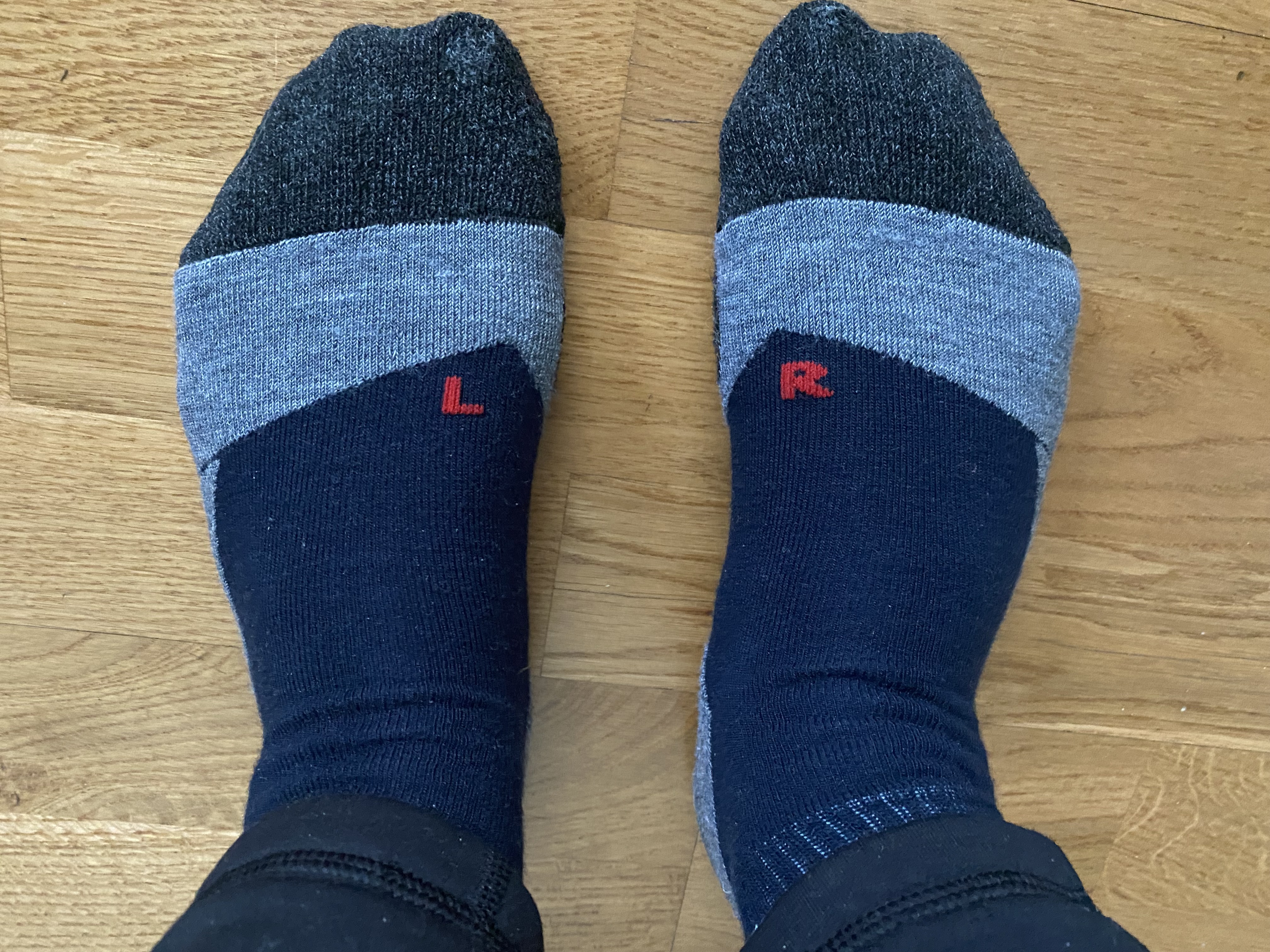 I can wear these FALKE socks for walking and hiking. An added bonus, they tell you what foot to put the sock on Left/Right. One day, I didn’t pay attention. I put the socks on the wrong feet. My daughters were traveling with me. I said, “Why do these socks feel so strange?”