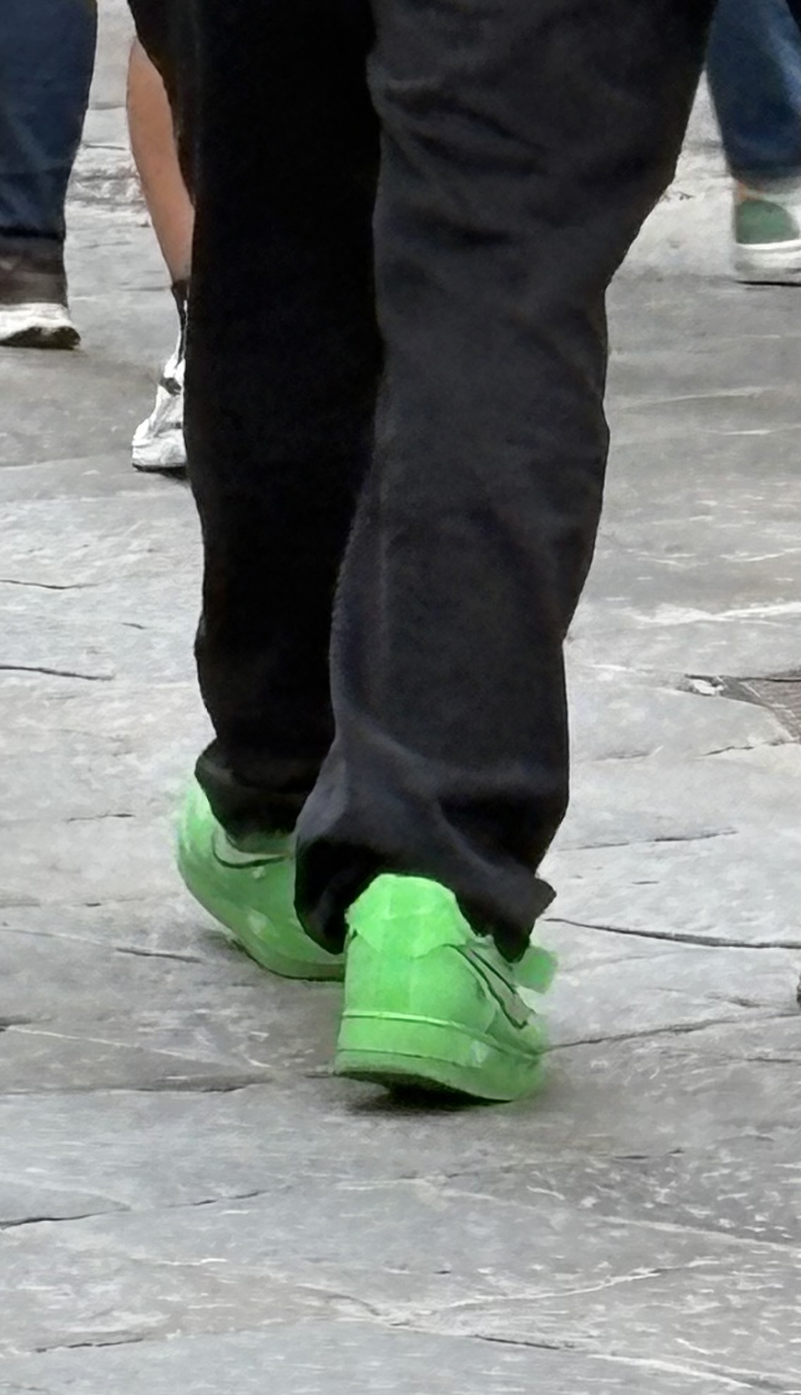 This was funny. I was sitting and having a gelato. Different tourists walking by. I heard this man telling a younger guy he was with. If we get separated, just look for my green shoes. Of course, my ears perked up, I looked and he was right… no chance of missing the “green shoes.” Brilliant idea!