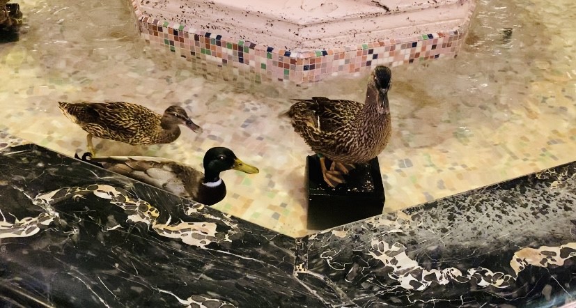 I was recently in Memphis for a wedding and we stopped off at The Peabody Memphis hotel to see the DUCK MARCH. I found this YouTube video, so you can see what it looks like. The ducks have a special home on the rooftop / penthouse. They come down the center elevator and march down the red carpet to the lobby fountain every day at 11:00 AM. People come from all over the world to see the ducks. THEN at 5:00 pm, the Duckmaster escorts the ducks back to their rooftop penthouse for the evening.
