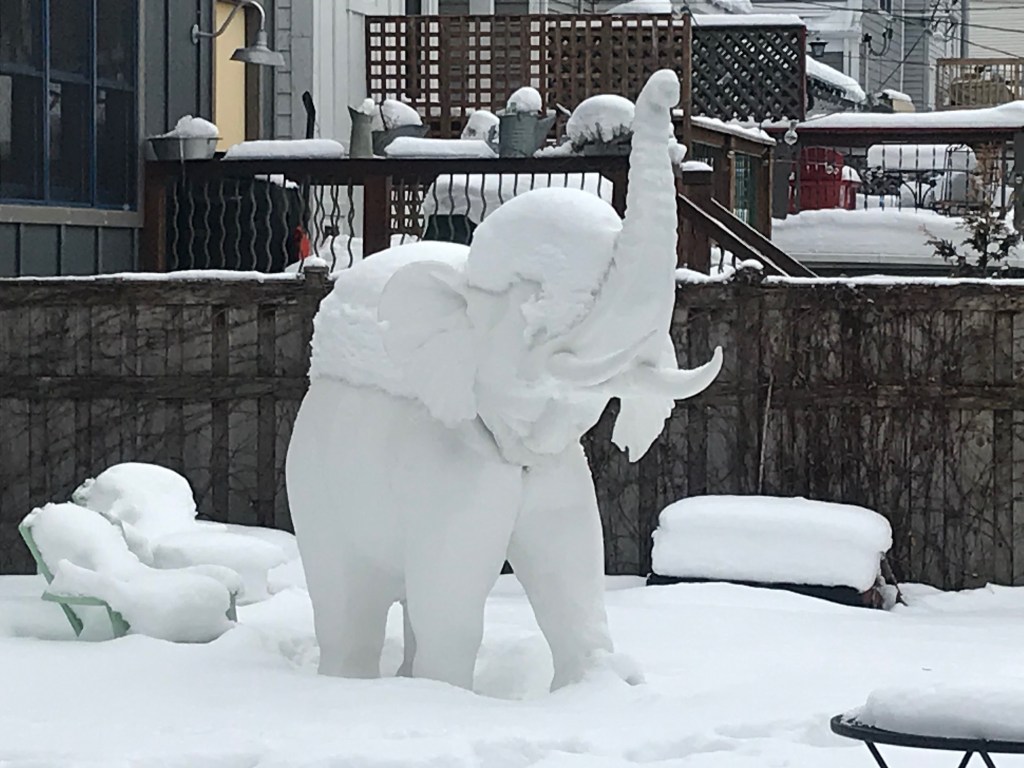 Look how beautiful. Now, it looks like this is an elephant sculpture with snow on it. Could it be a man made snow sculpture? How would they get the trunk to stay up?