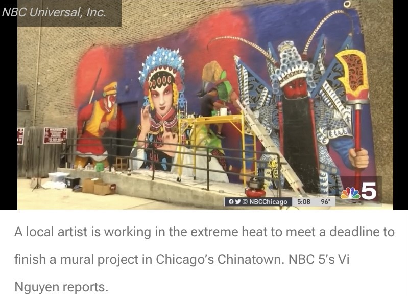 I happened to catch NBC 5 Chicago news recently and this segment by Vi Nguyen caught my attention. An amazing mural by Chicago artist Rich Lo. For this mural, he chose three famous Opera characters commonly seen in Cantonese opera. They are legendary warriors. Lo’s father was a rising star in the Chinese Opera. He saw his father perform on stage, so this is close to his heart.