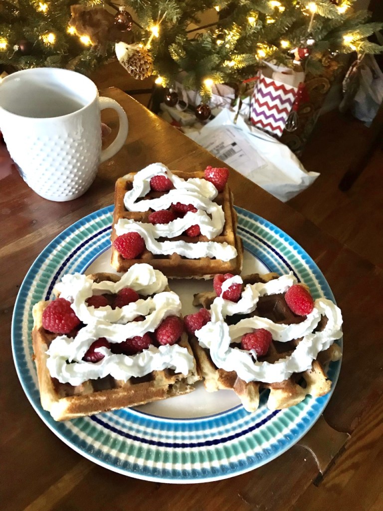 My daughter made protein waffles. Interesting ingredients: vital wheat gluten, oat flour, fat free cottage cheese, egg whites, some water. Before you shake your head, they were good. I would not have known they weren’t made from a waffle mix. They were delicious, very filling.