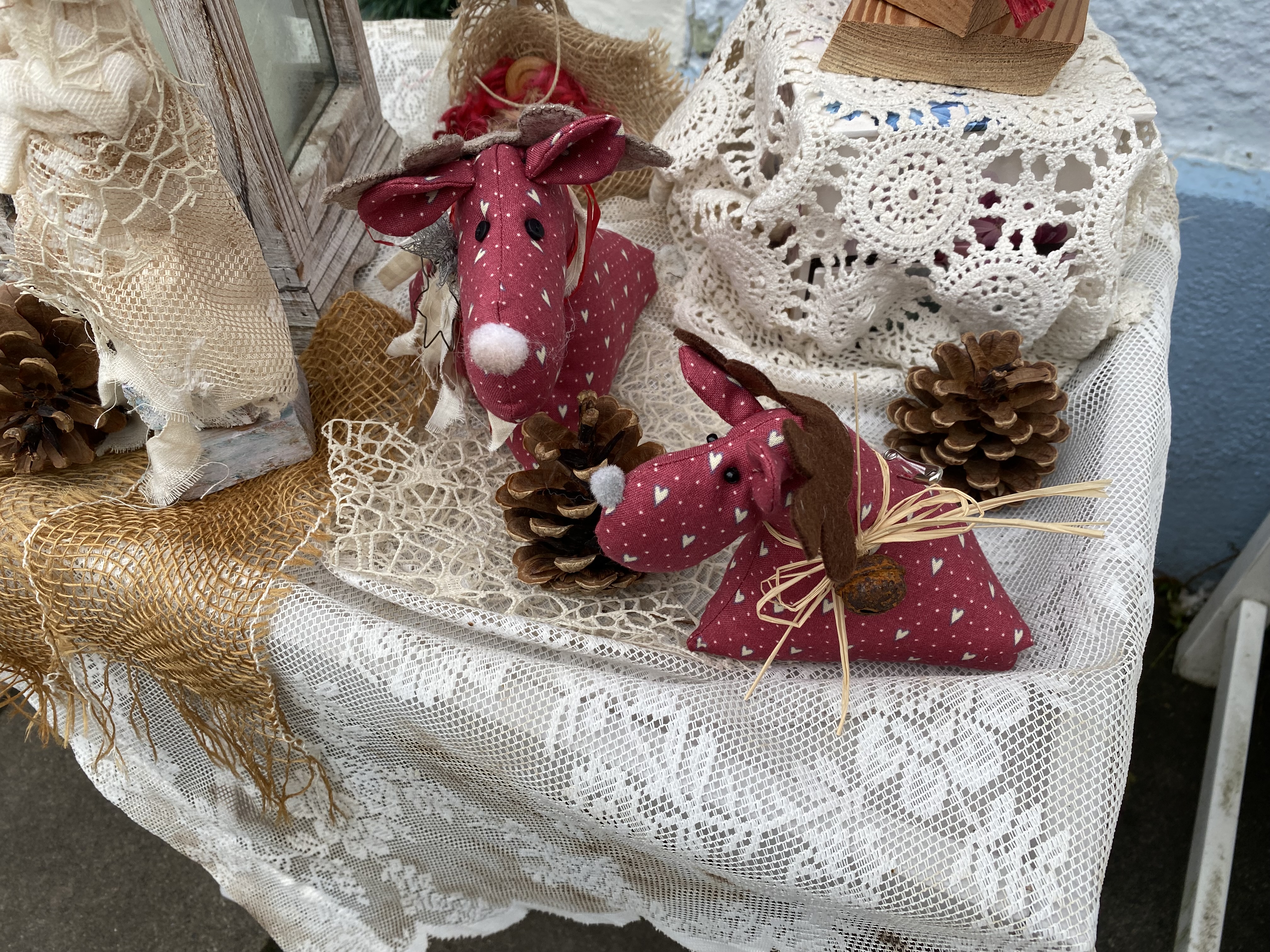As I walked the neighborhood, I came across a sewing store. She had patterns of a reindeer door stop. Of course, I had to buy it and a pattern for a cute bear, I bought that too.