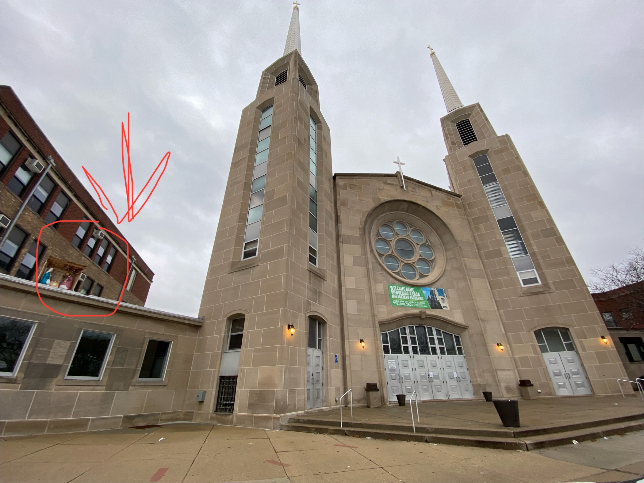 I thought I would have a view of the golden dome in front of the church. Instead, I saw this Manger scene on the top of the building. This church had no grassy area, so they got creative.