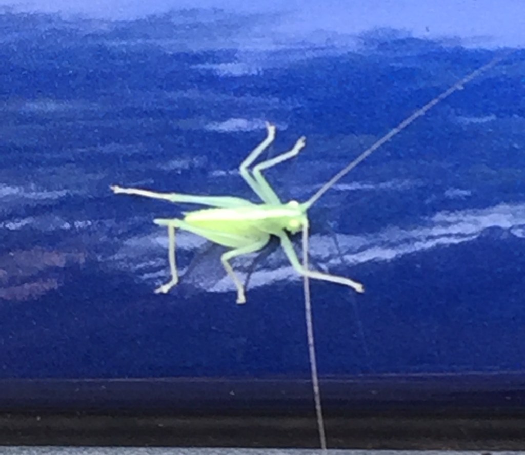 Sometimes we catch a perfect photo. I think this is a grasshopper, but I have never seen one this bright green before. Have you?