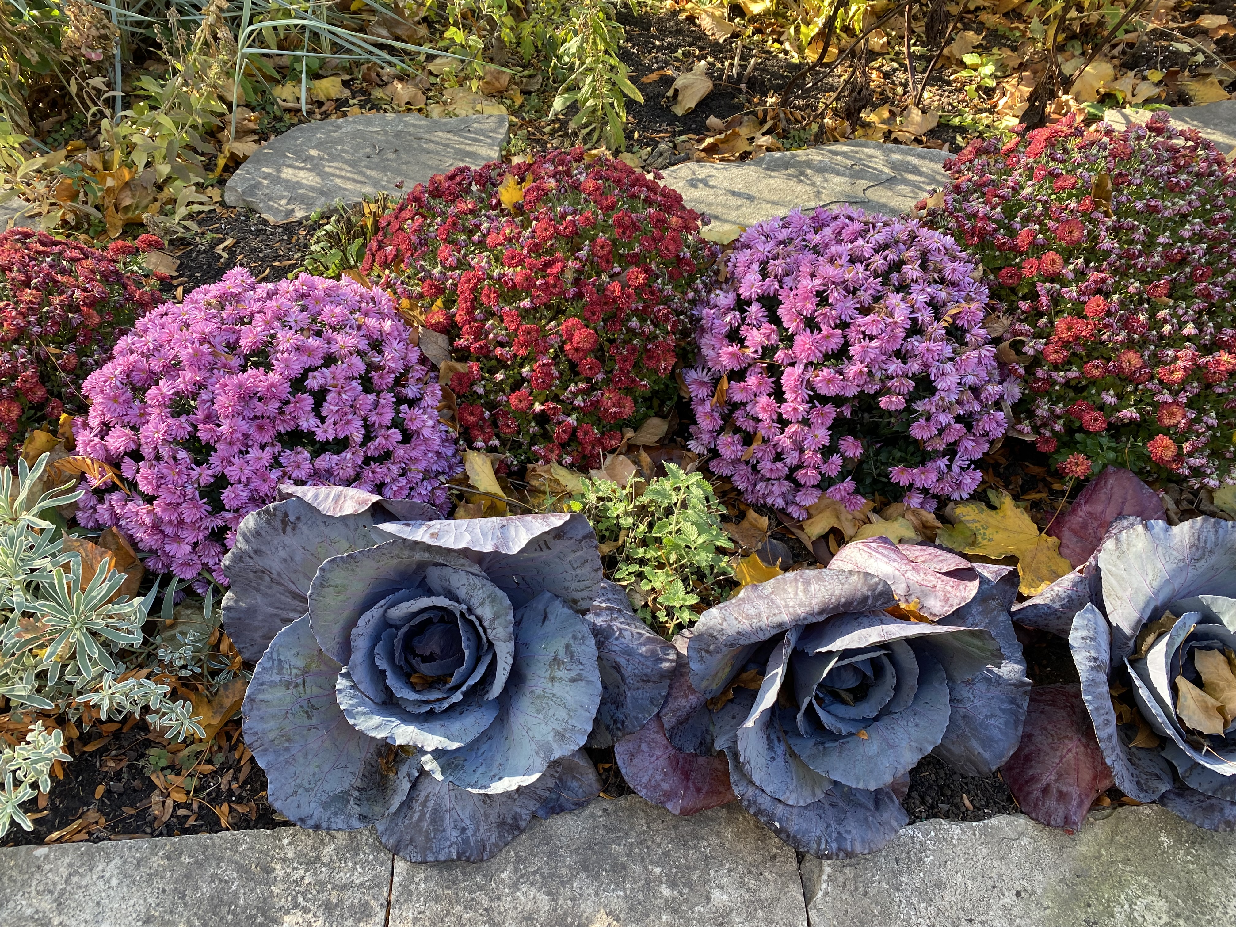 Winter is coming, the leaves are falling. However, when I am walking, I see there are STILL some flowers alive and well. The colors are so vibrant for this time of year. Look at those ornamental cabbage plants. I rarely see those.